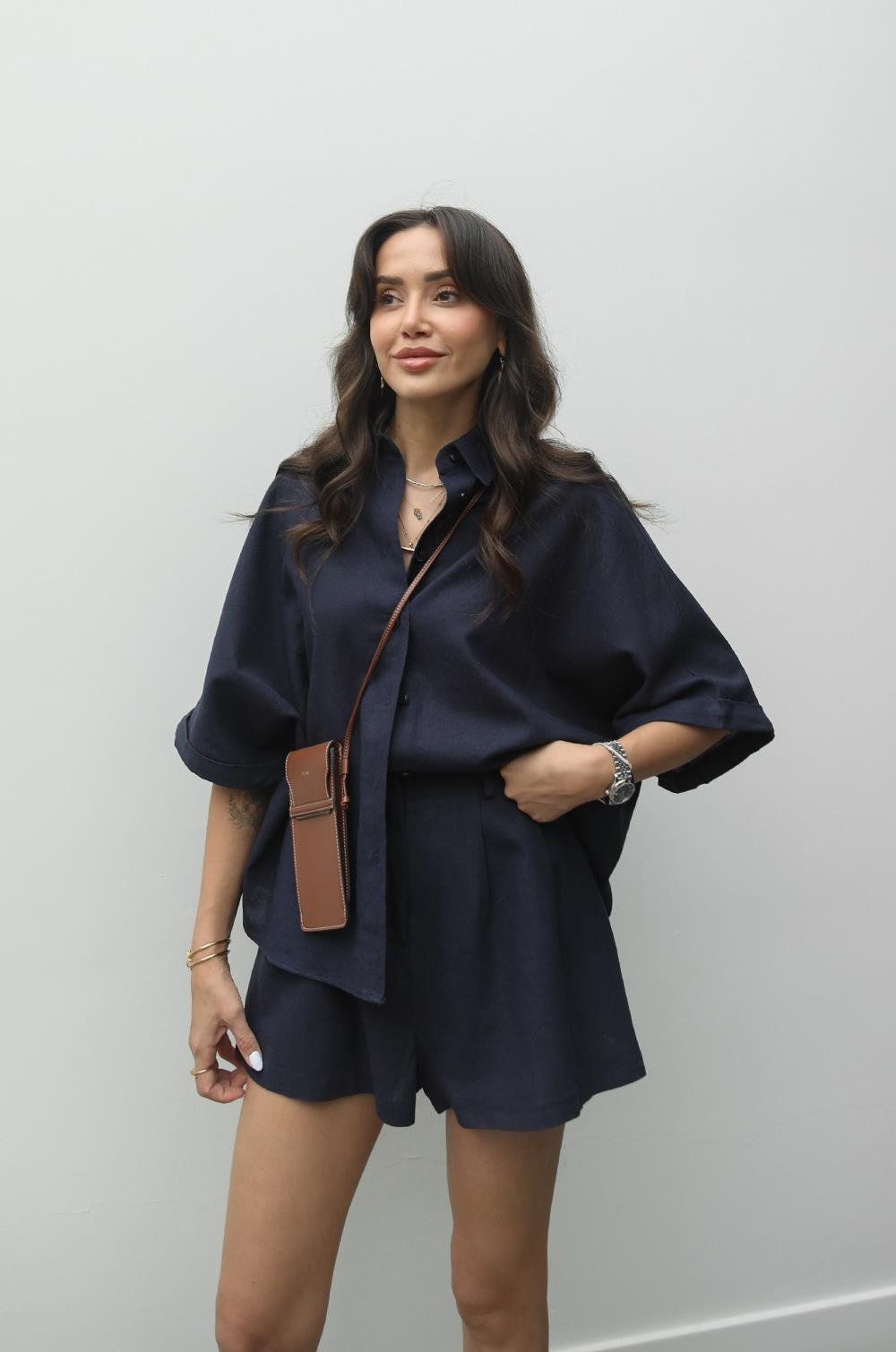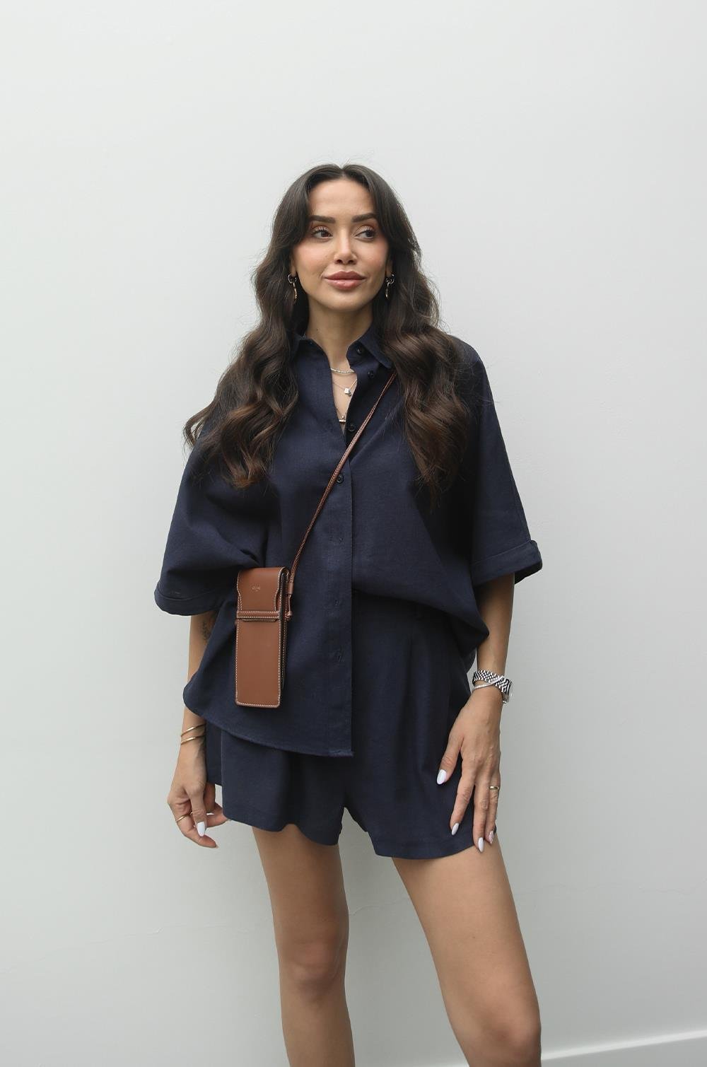 LACIVERT HASIR KEMERLI ŞORT GÖMLEK KETEN TAKIM