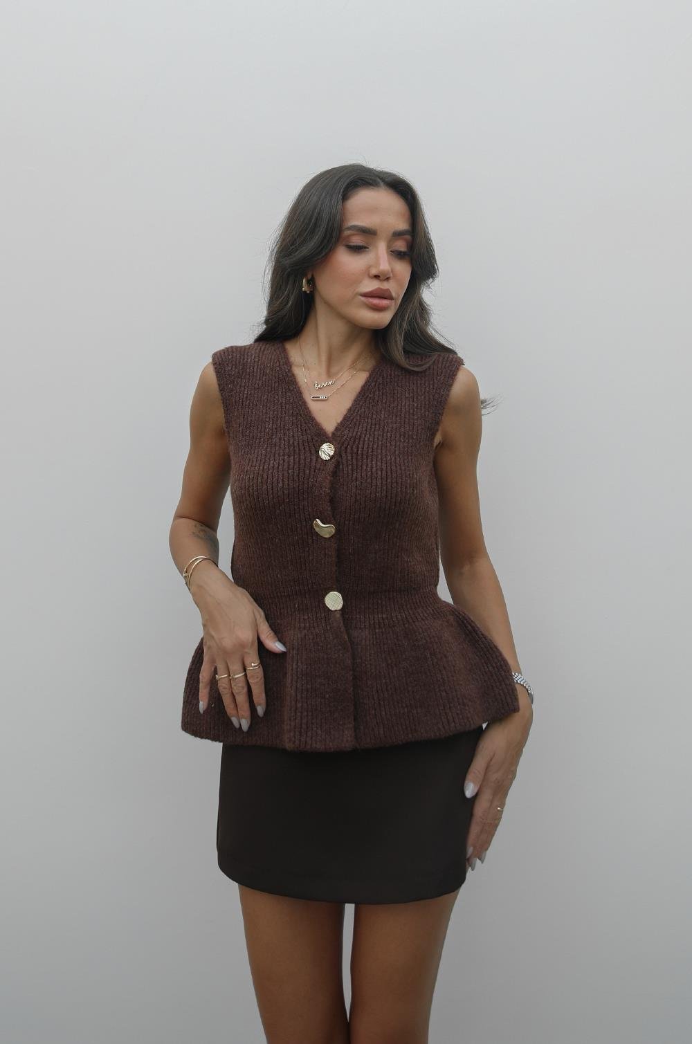 KAHVERENGI BELINDEN VOLANLI TRIKO YELEK