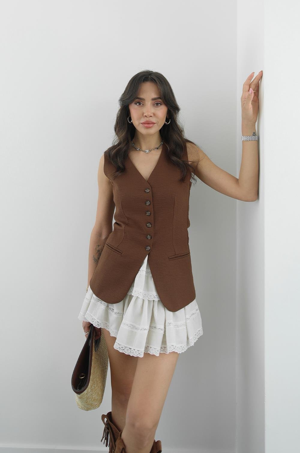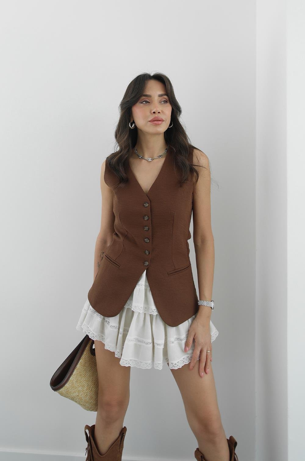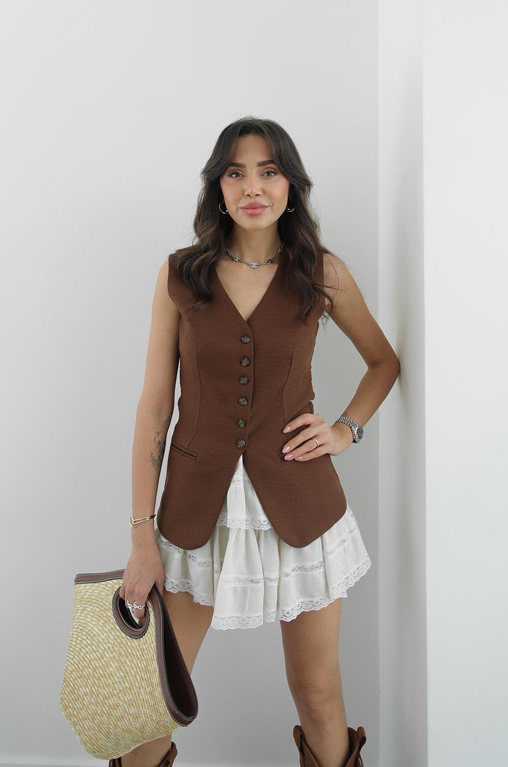 KAHVERENGI GRETA KETEN YELEK