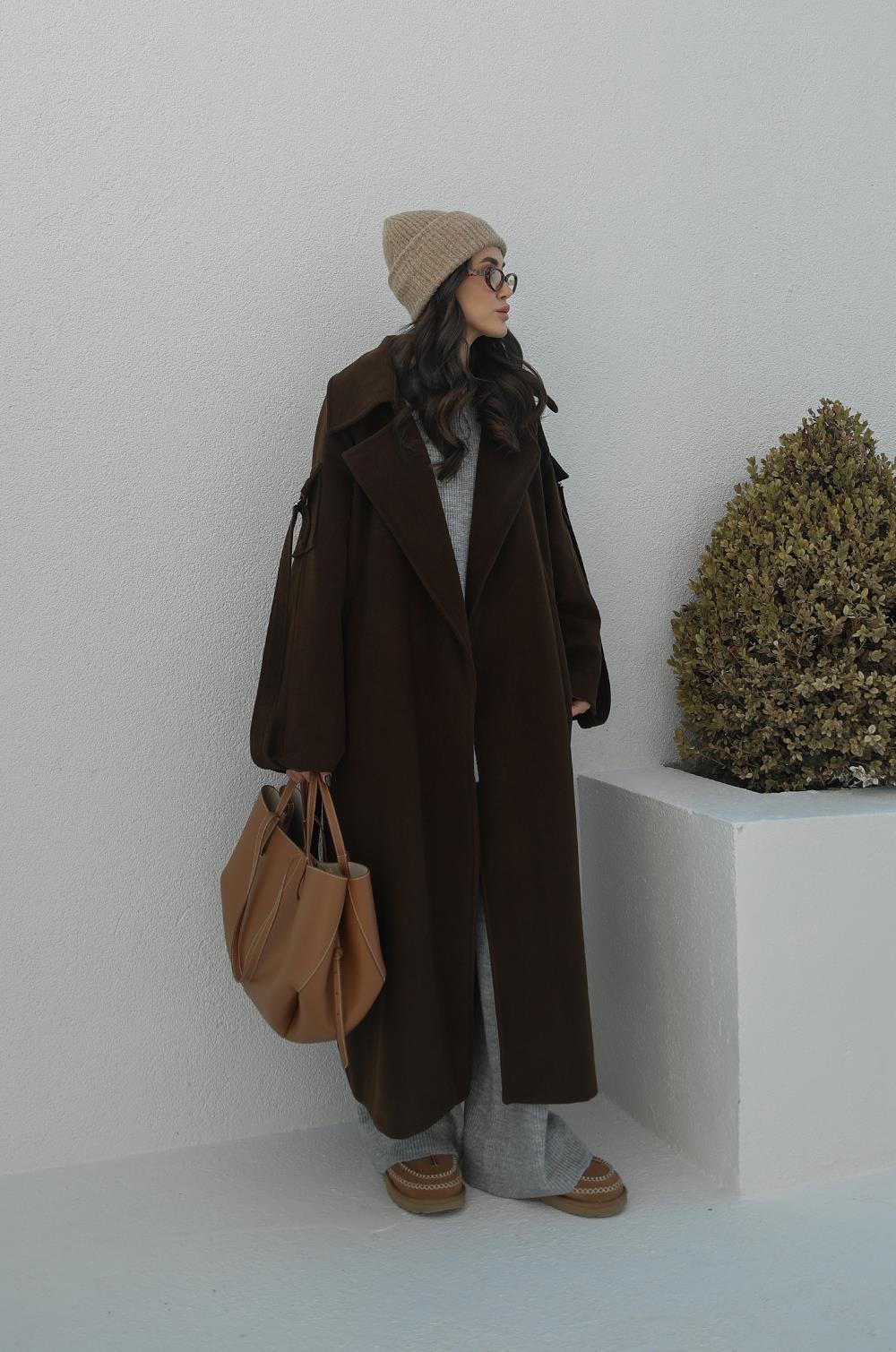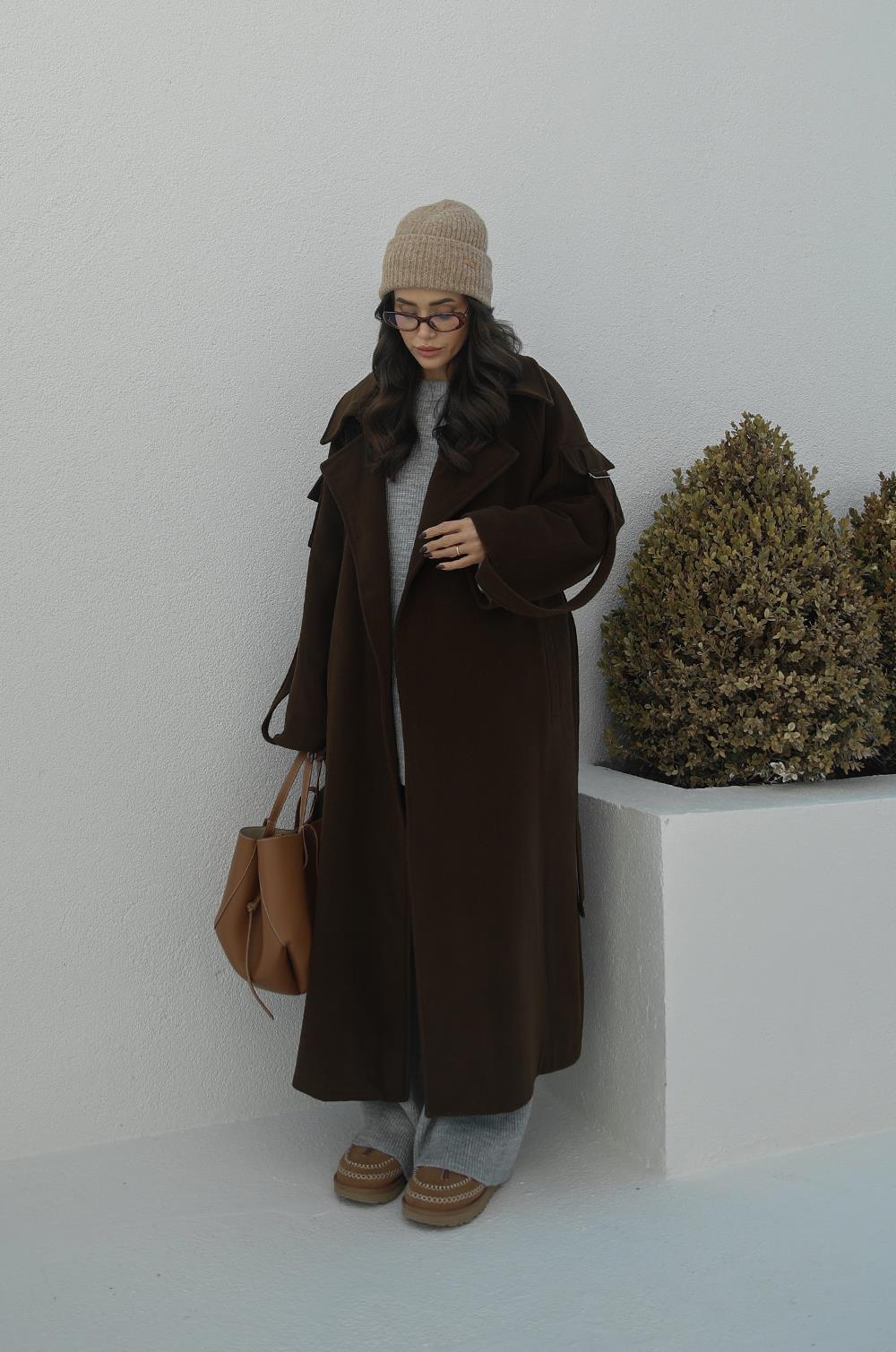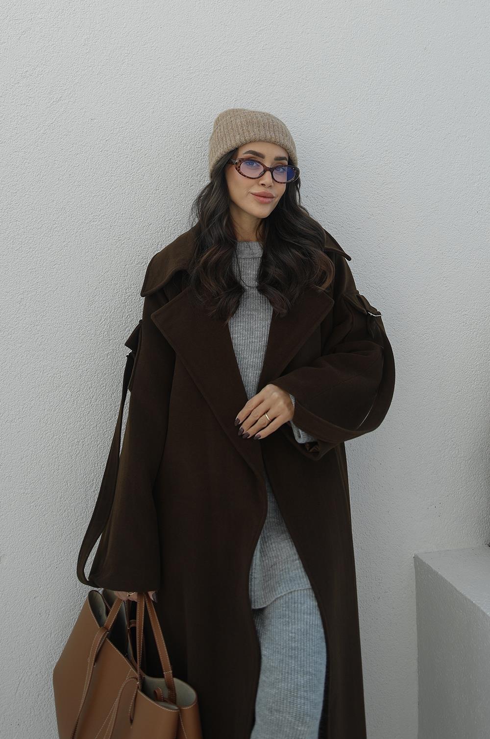 KAHVERENGI HILDA KOLLARI CEP DETAYLI KAŞE KABAN