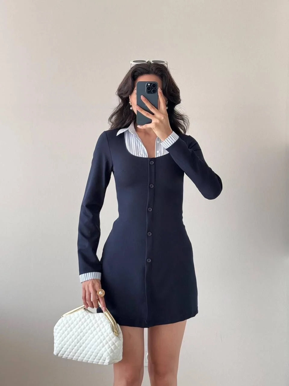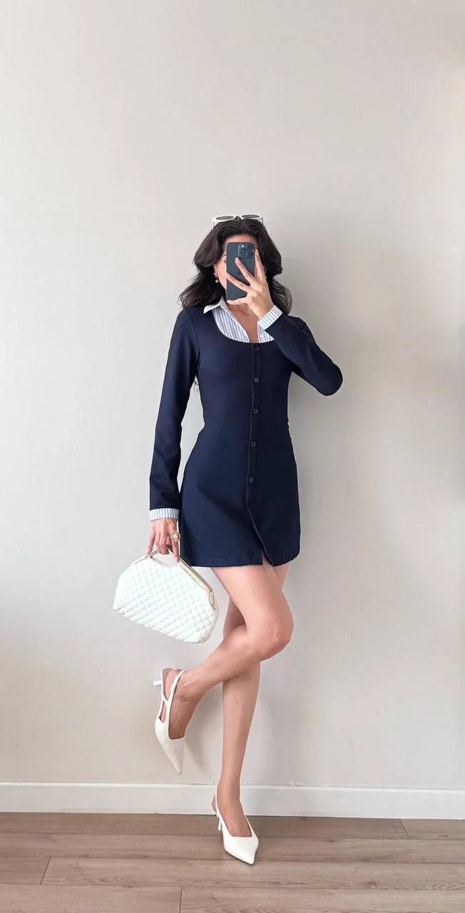 Lacivert Çizgili Mini Uzun Kollu Gömlek Elbise