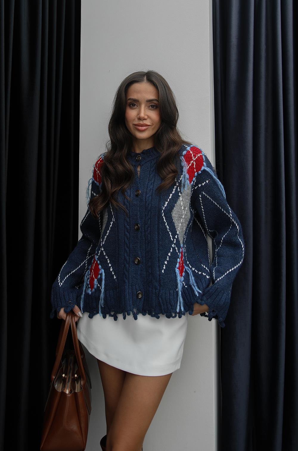 MAVI PÜSKÜL DETAYLI DESENLI HIRKA