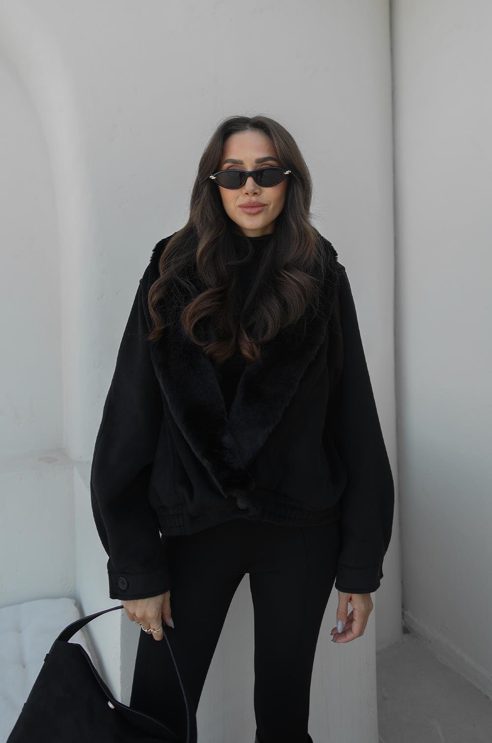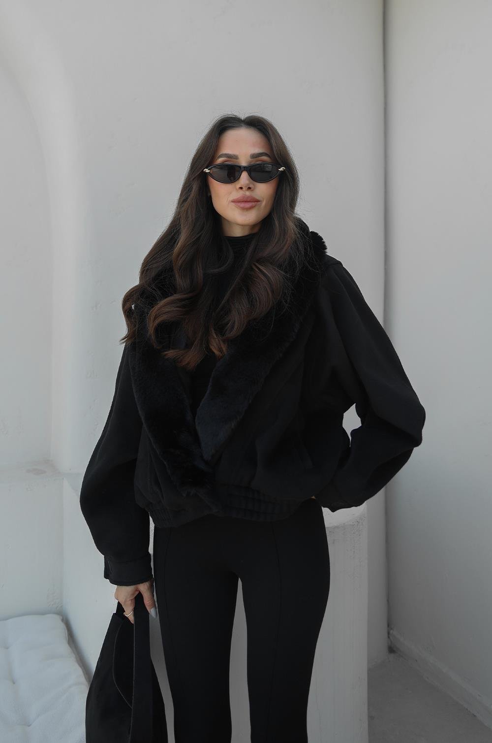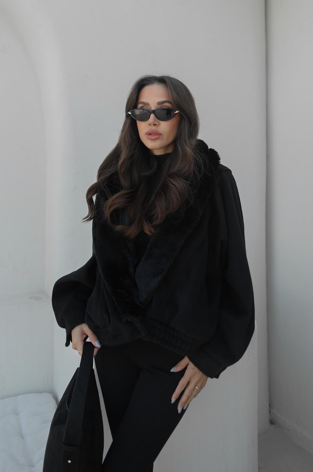 SIYAH PELUŞ KÜRK YAKALI MONT