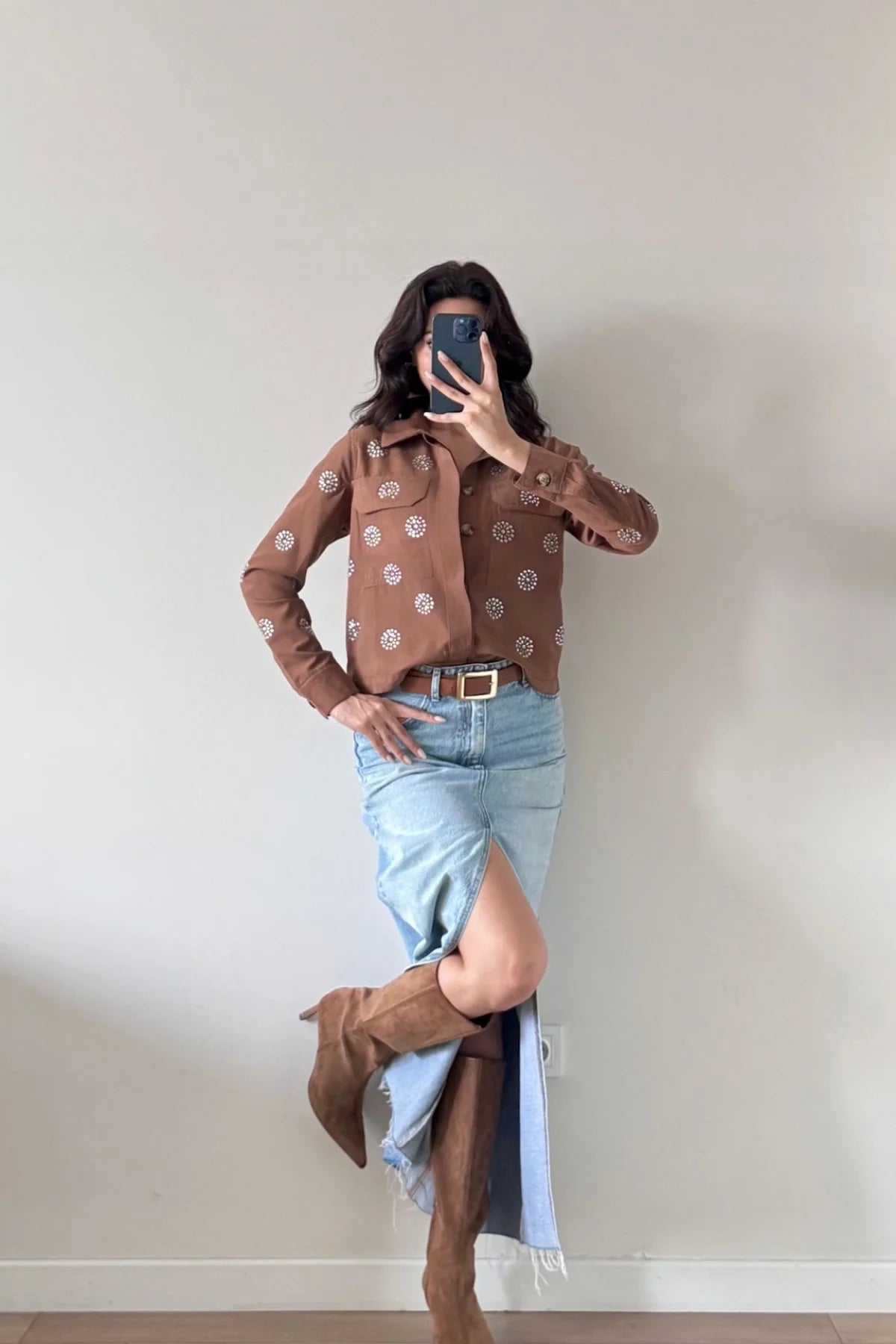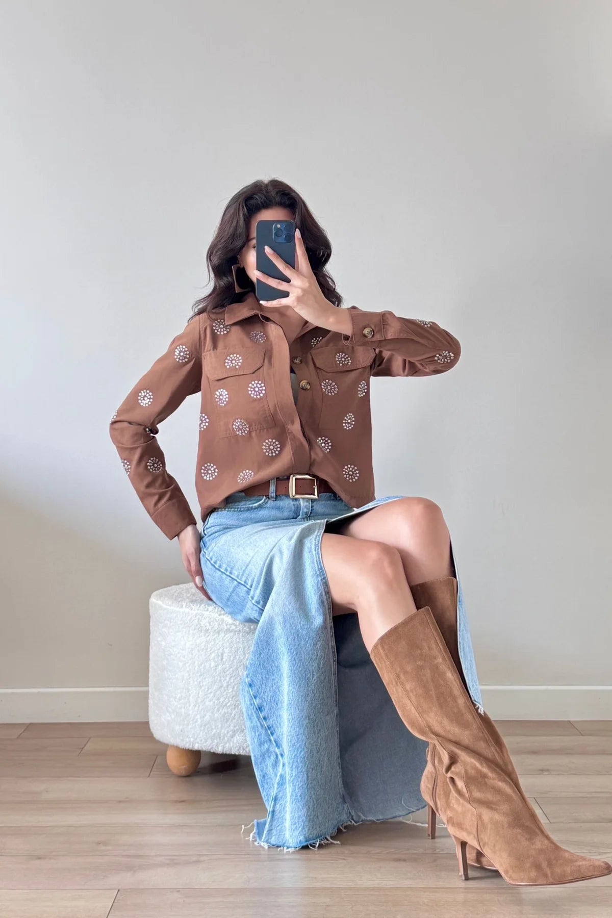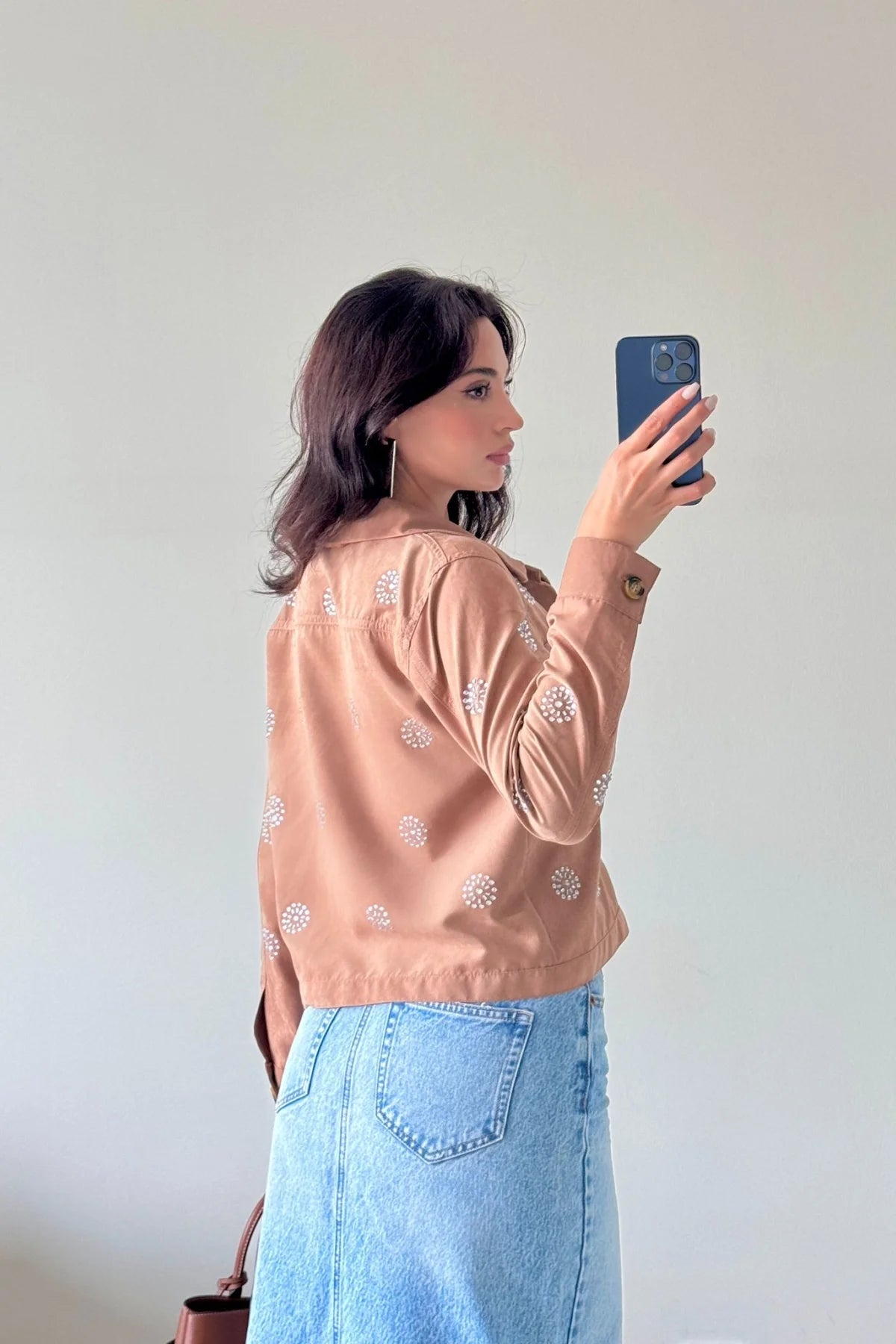 Taşlı Uzun Kollu Cepli Düğmeli Süet Ceket